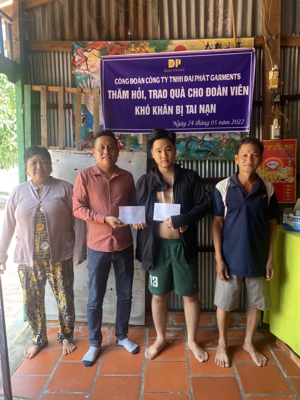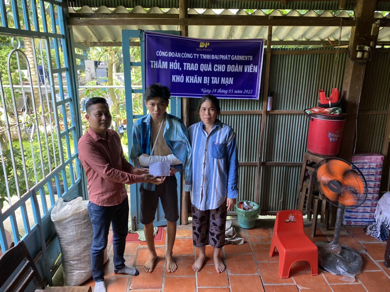 Hưởng ứng hoạt động Tháng Công nhân - Tháng hành động về An toàn vệ sinh lao động năm 2022, chiều ngày 24/5/2022 công đoàn cơ sở công ty TNHH Đại Phát Garments phối hợp với Ban Giám đốc Công ty đến thăm hỏi 02 công nhân bị tai nạn lao động trên đường về nhà có hoàn cảnh khó khăn. Tại mỗi nơi đến công đoàn cơ sở thăm hỏi, chia sẻ những hoàn cảnh khó khăn đến công nhân bị tai nạn lao động, đồng thời động viên công nhân lao động giữ gìn sức khỏe, tiếp tục phấn đấu vươn lên để ổn định cuộc sống và trao tặng mỗi trường hợp bị tai nạn lao động từ 2.000.000 đồng đến 3.000.000 đồng./.